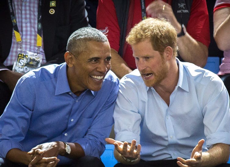 Former U.S. President Barack Obama and Prince Harry watch wheelchair basketball at the Invictus Games in Toronto on Friday, Sept. 29. Obama spoke earlier in Toronto about the importance of global citizenship.